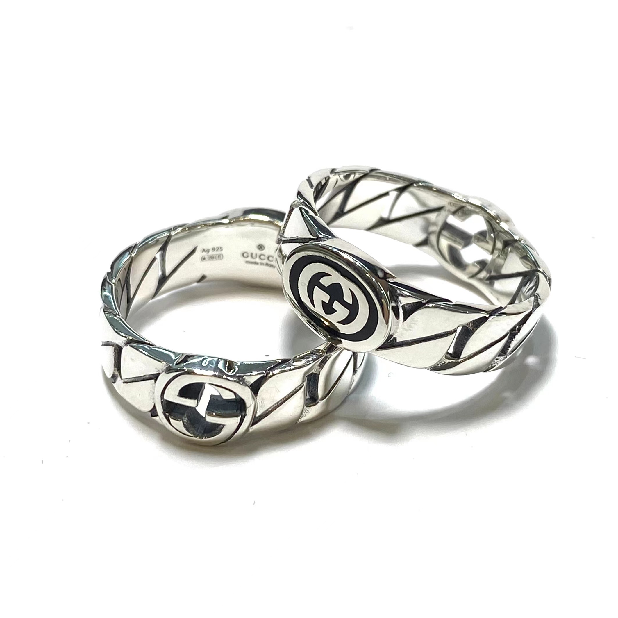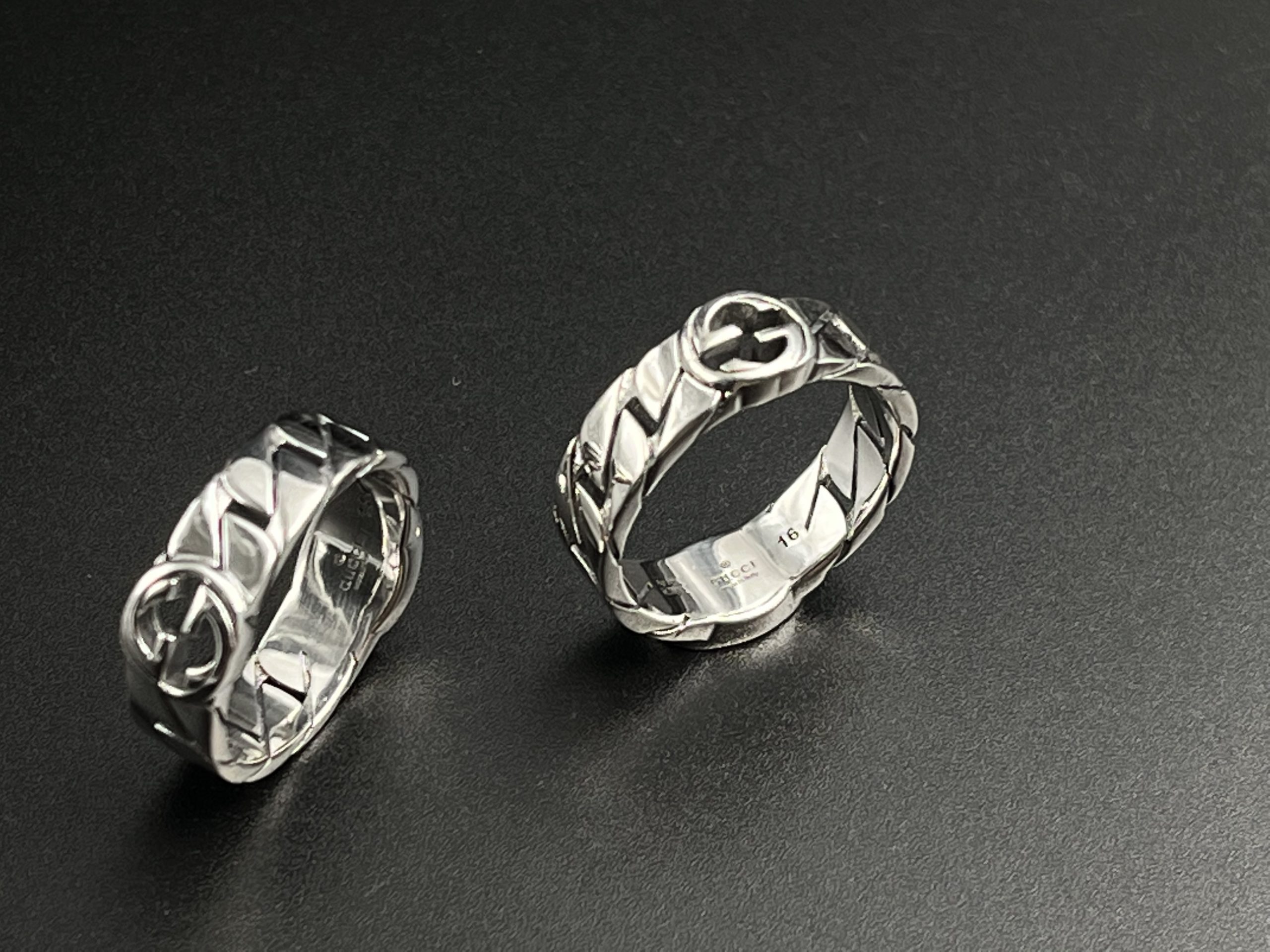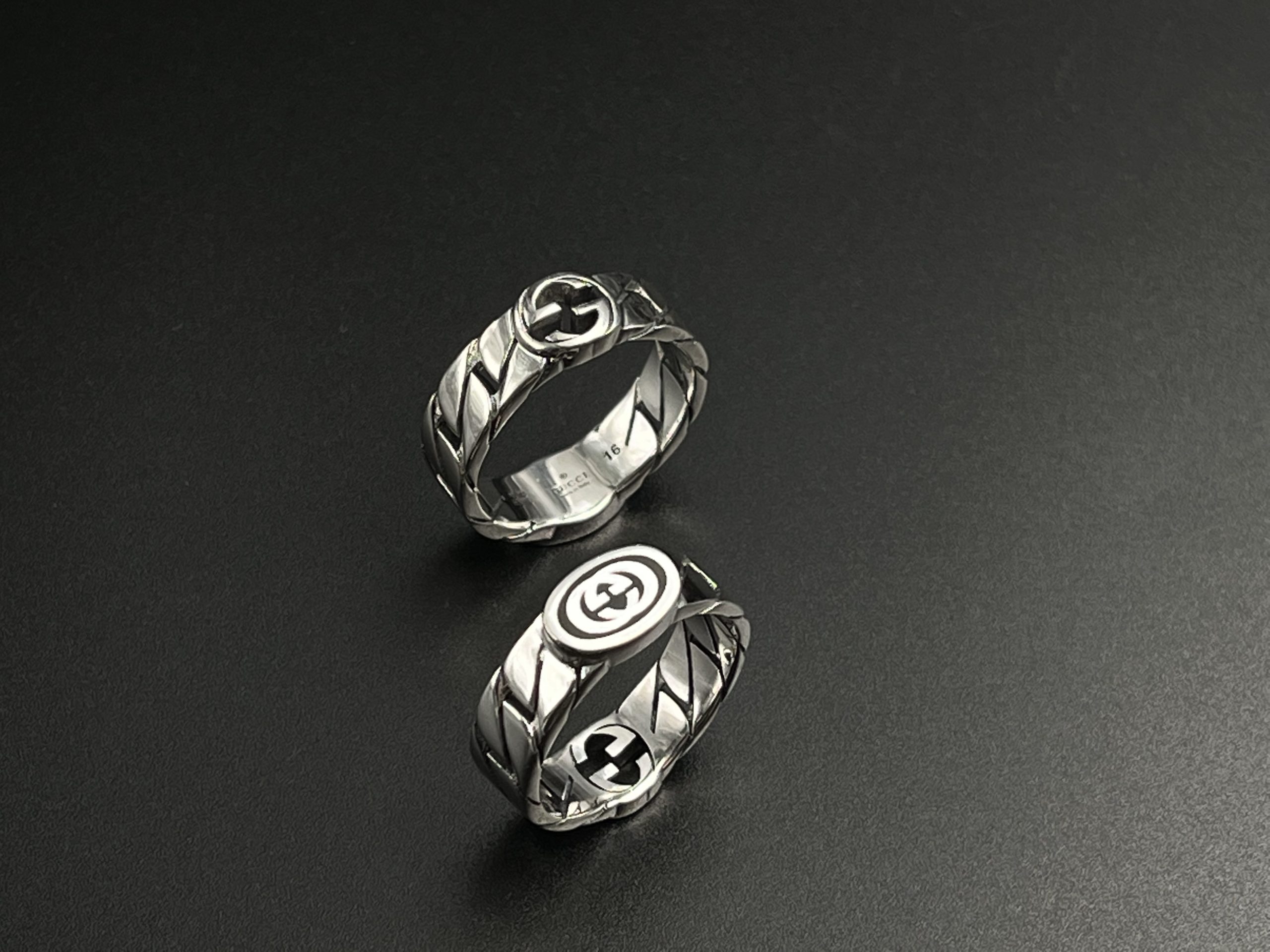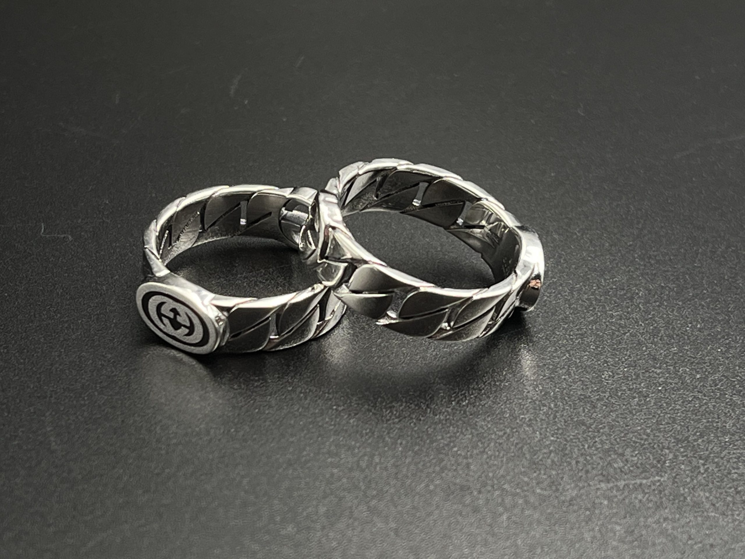A sculpted chevron band built with GG’s Icon emblem on both sides, creating a balanced and symmetrical design. This version emphasizes dual branding and stronger visual presence compared to the single icon ring.