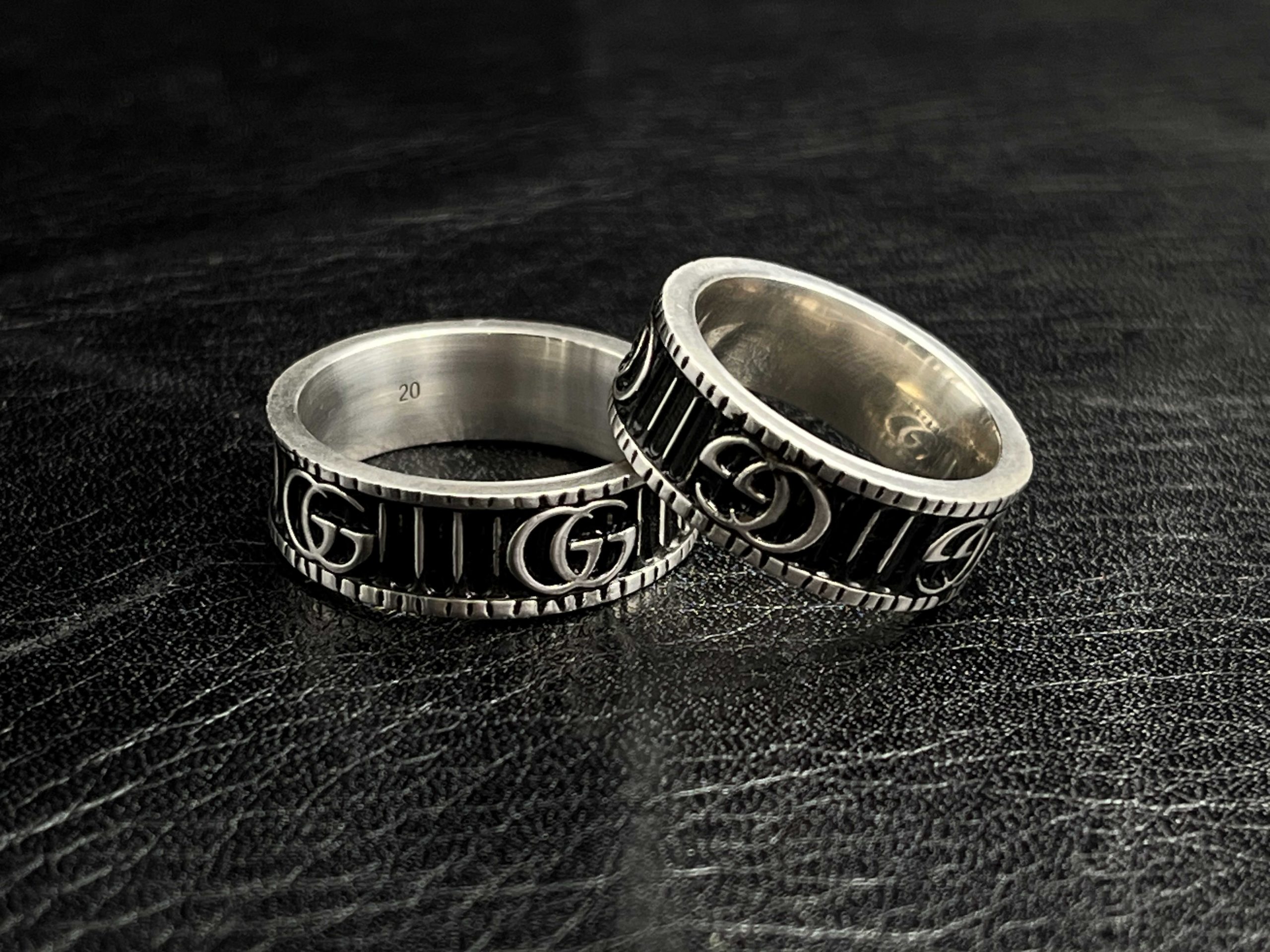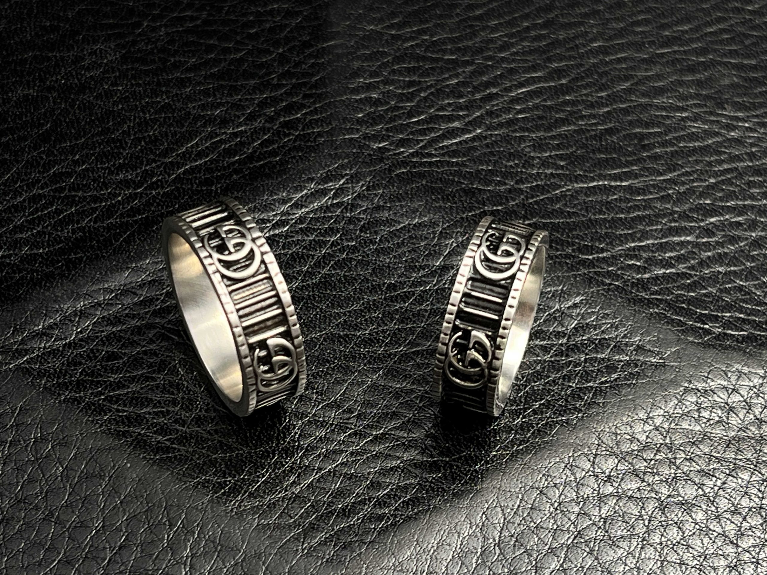 The GG Engraved Icon Band Ring features a clean, structured design built around raised GG emblems and deep vertical relief ridges. Crafted from solid 925 sterling silver, the ring is finished with darkened oxidized detailing for contrast and depth.