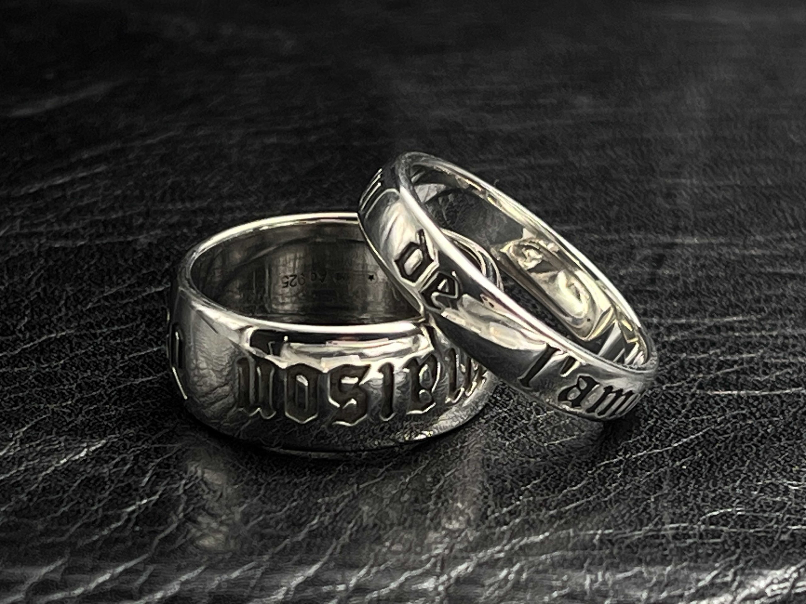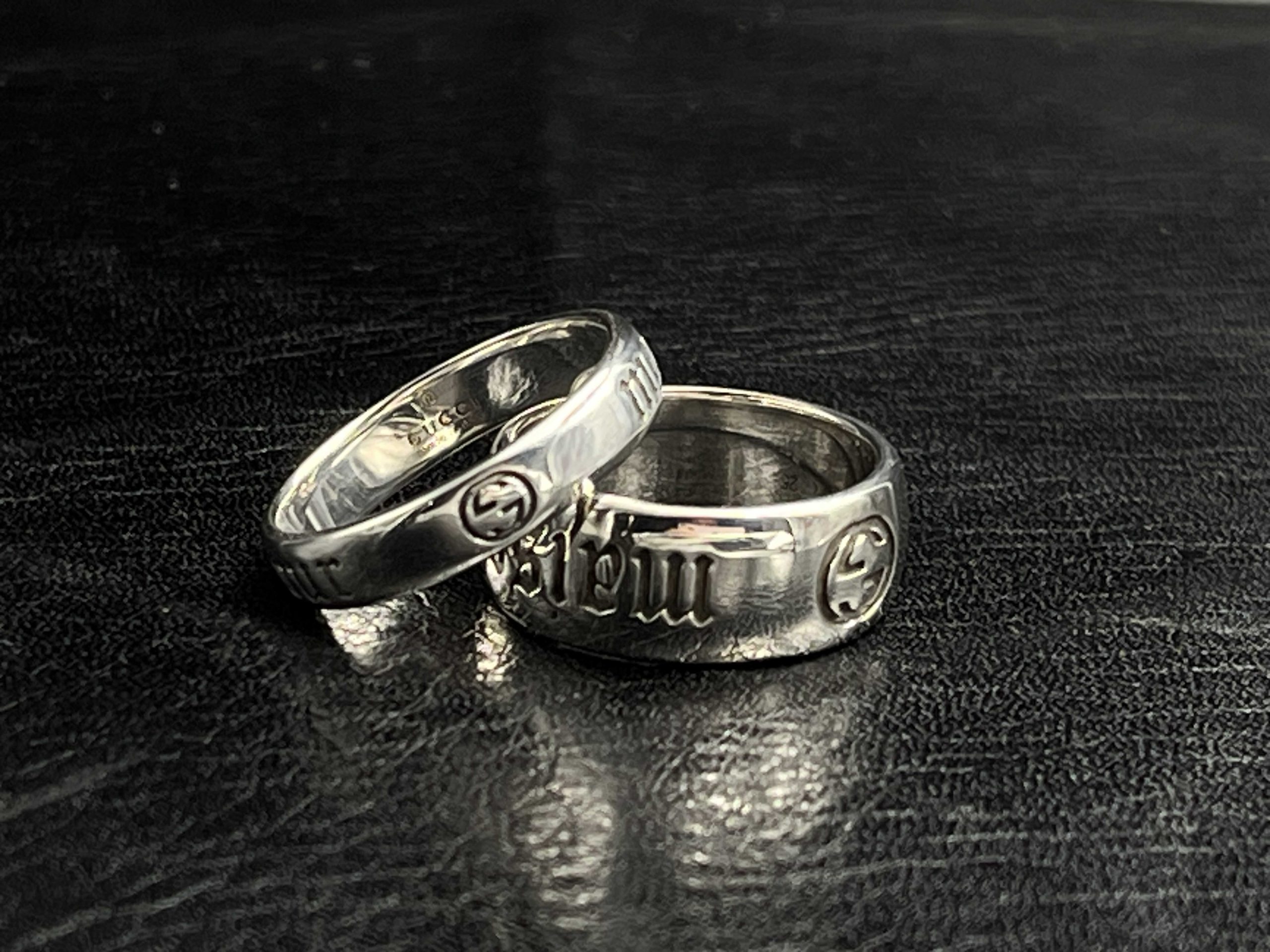 A polished statement band from GG’s Icon line, engraved with the signature Icon emblem and Gothic “L’Amour” lettering. A clean, high-shine silver finish contrasts against deep oxidized text, creating a bold and timeless piece suitable for daily wear or stacking. Available in both a sleek 5MM profile and a thicker 9MM band for a stronger silhouette.