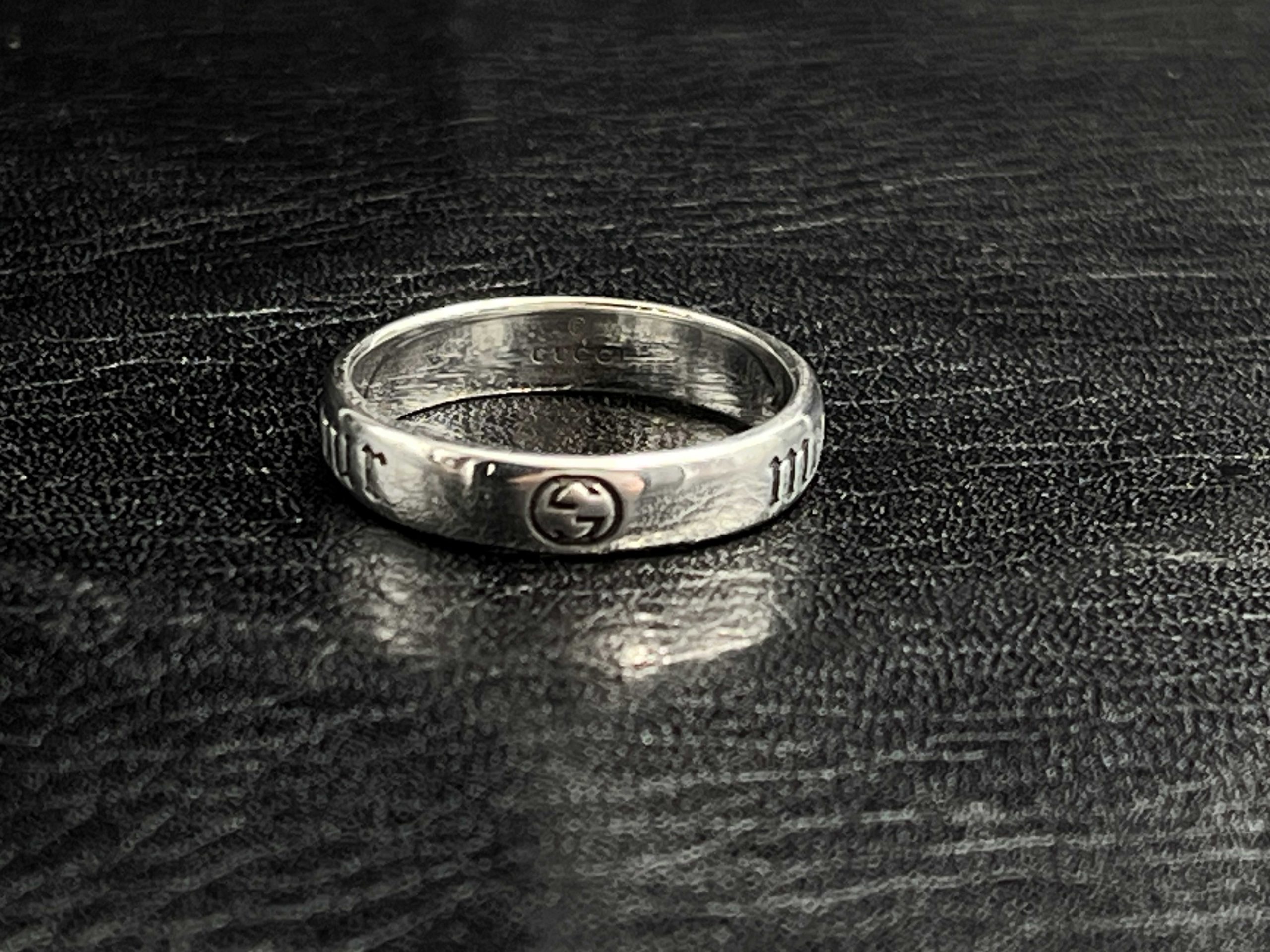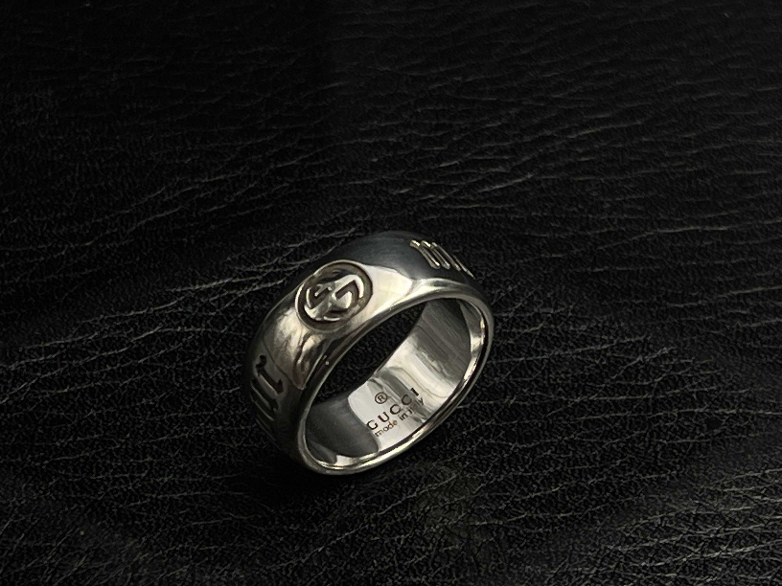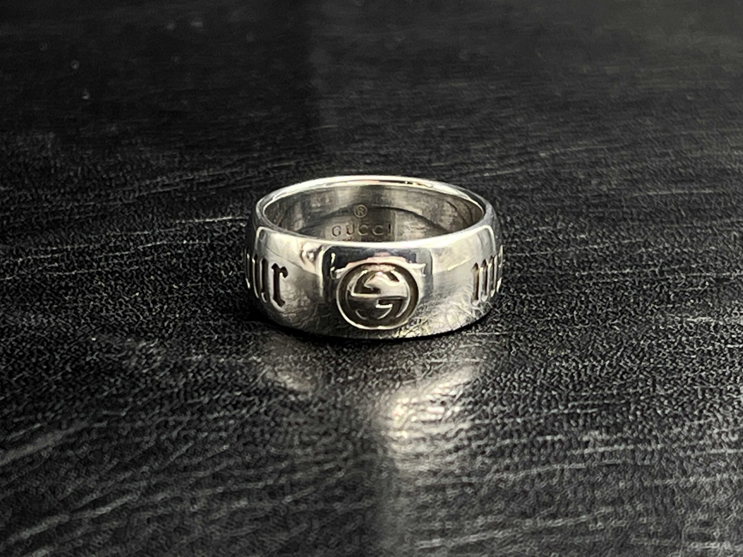 A polished statement ring combining GG’s Icon emblem with bold engraved Gothic lettering.