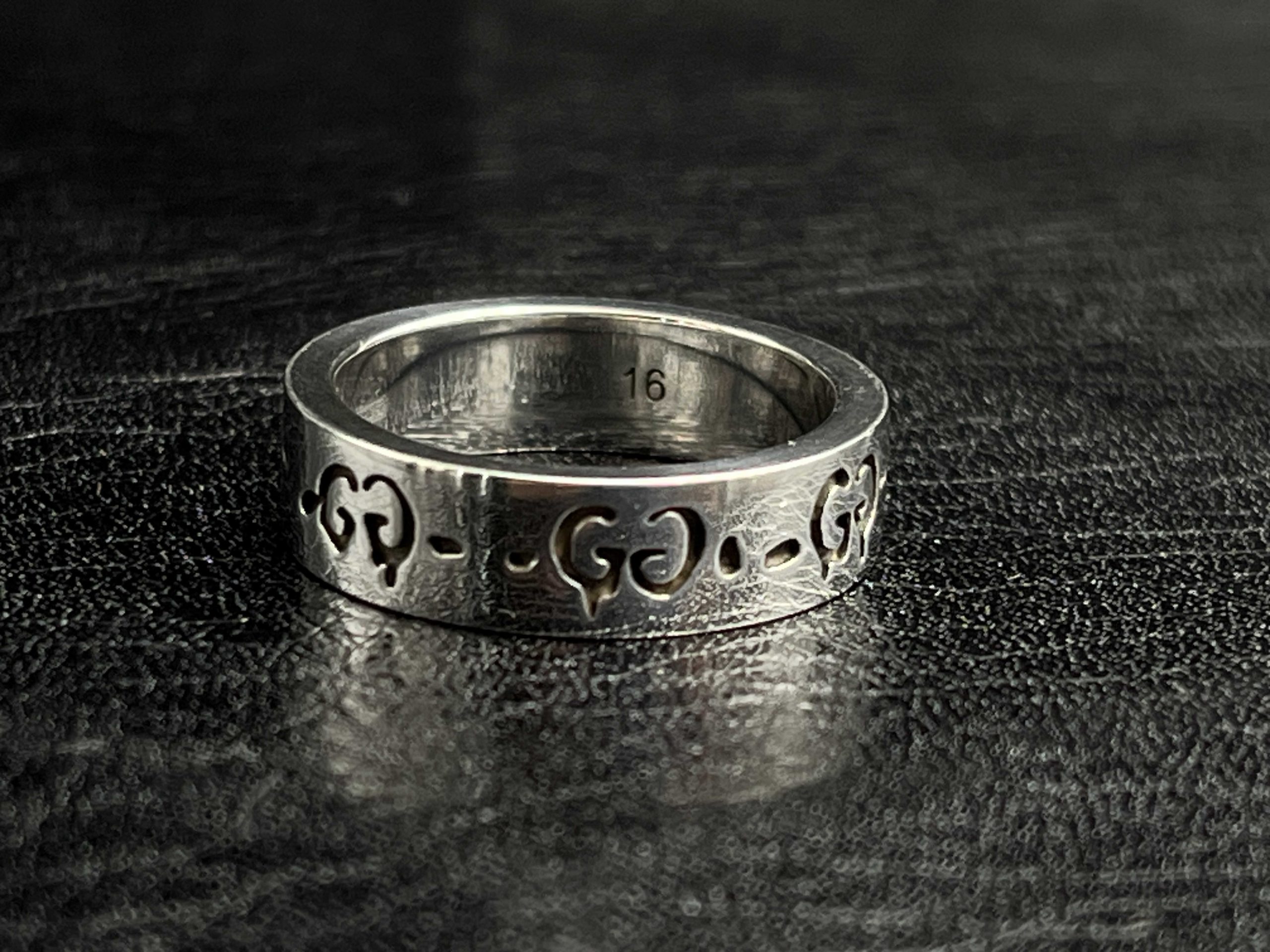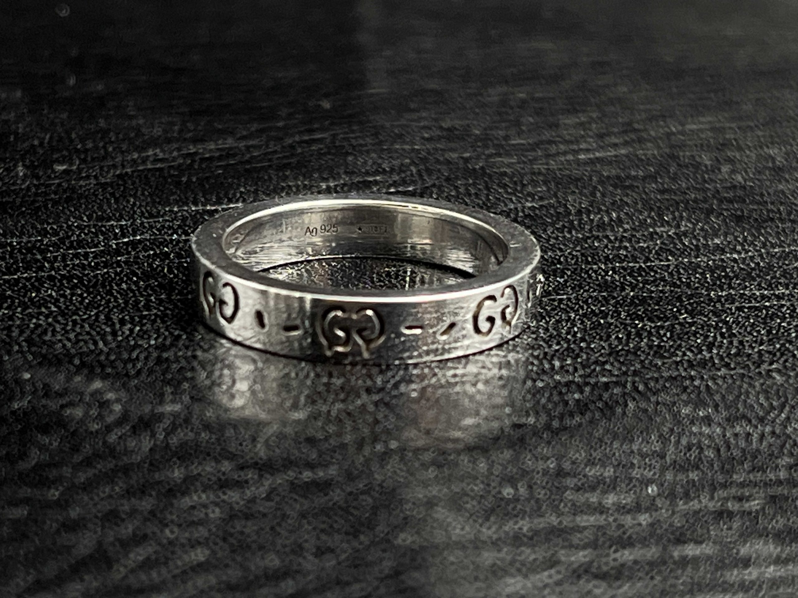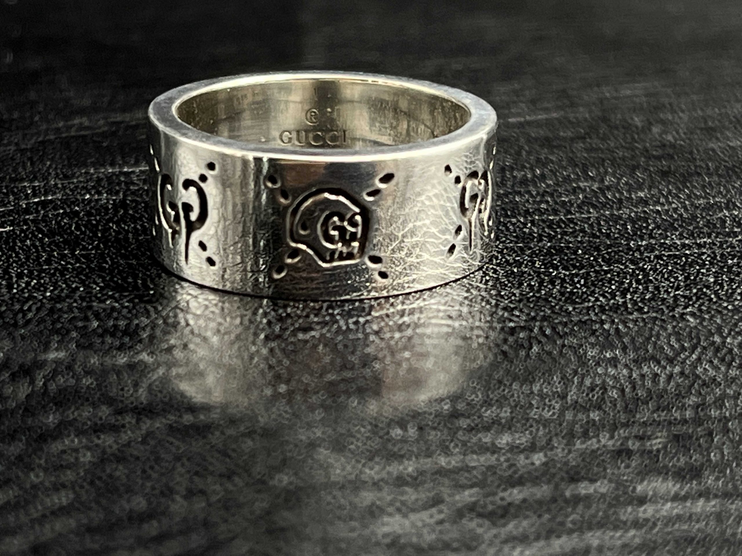 Engraved Icon skull band ring available in 4MM, 6MM, and 9MM widths. Crafted from 925 sterling silver with oxidized detailing, offering a clean minimal look with the classic GG Icon skull pattern.