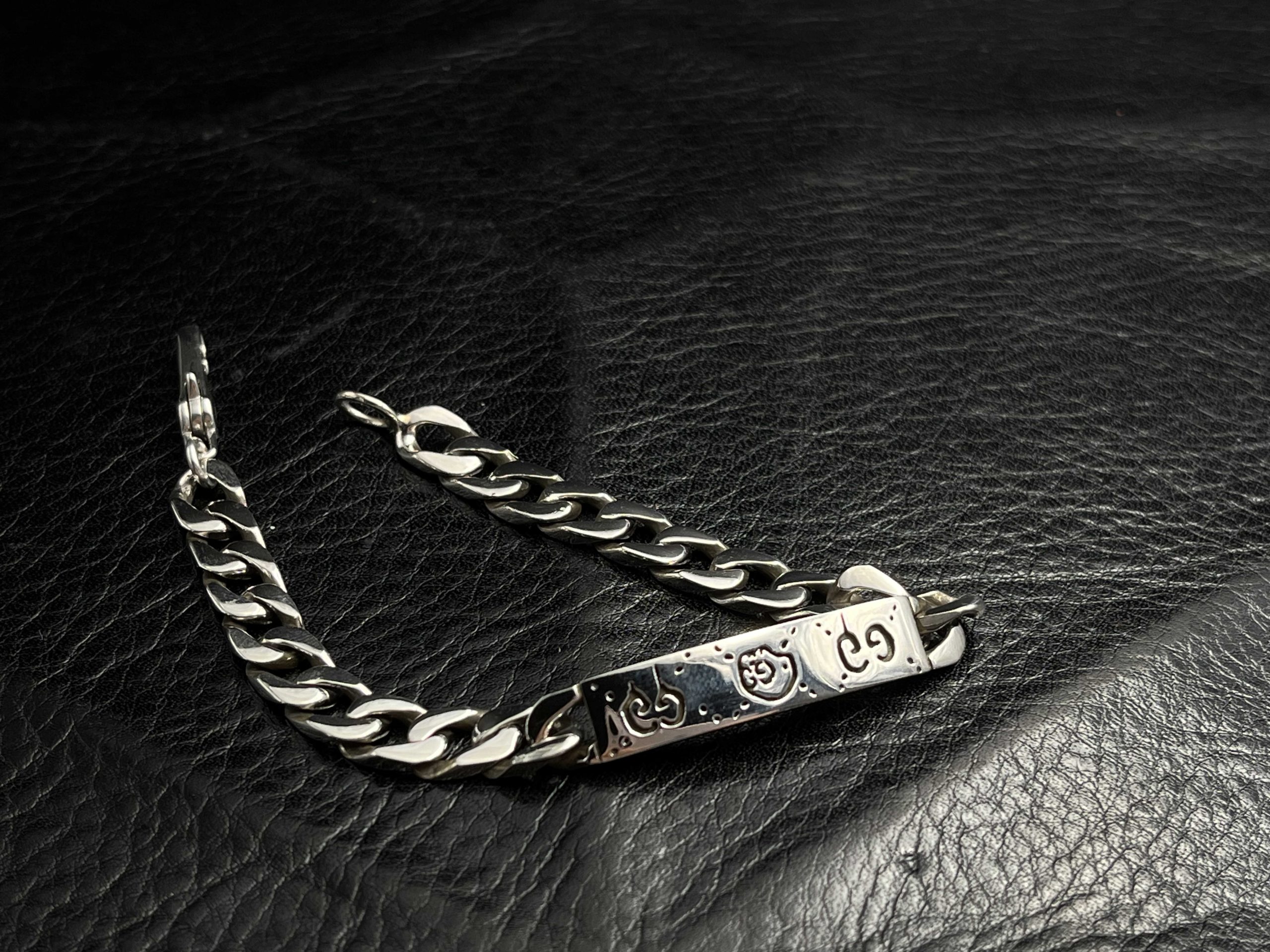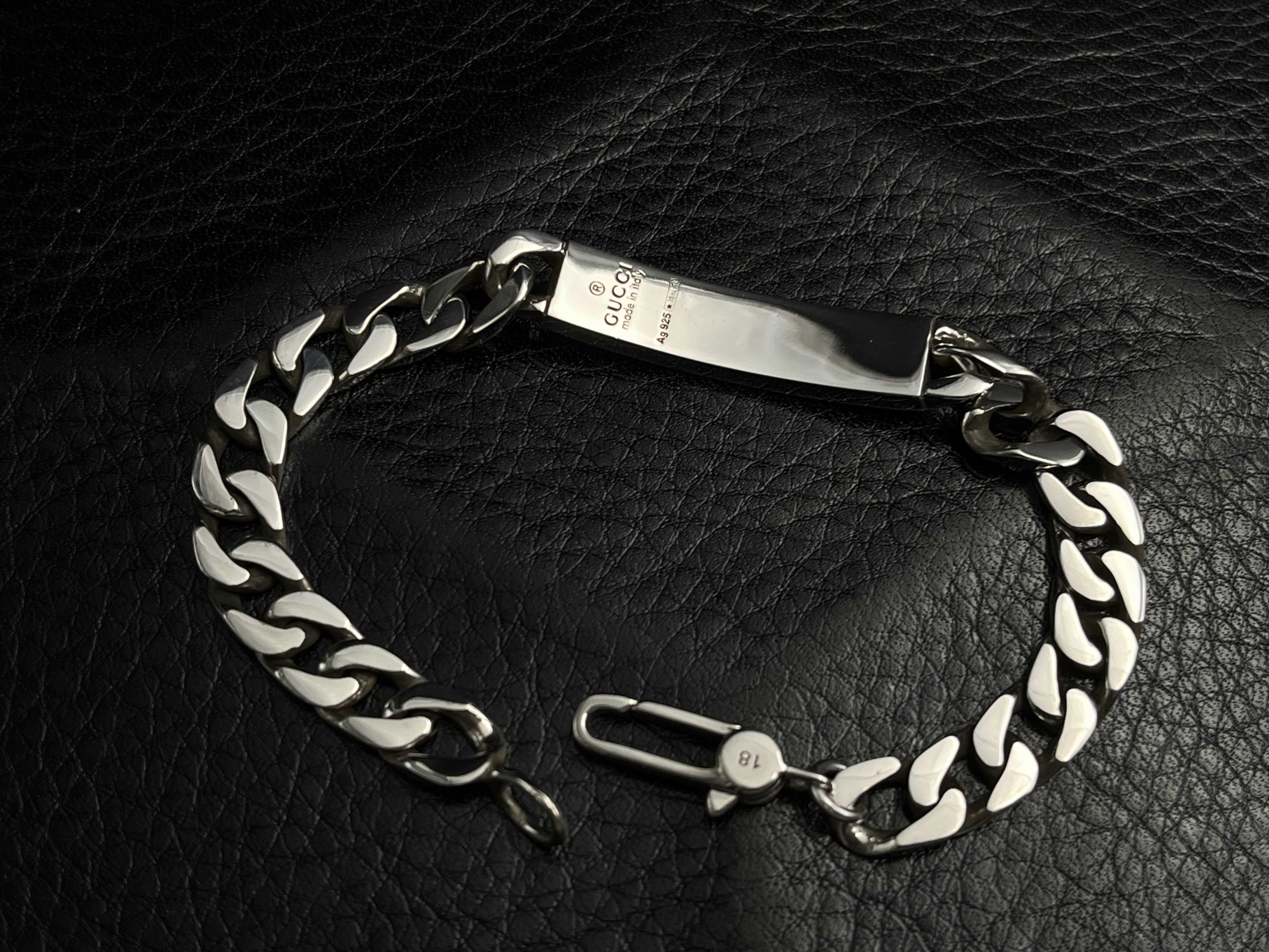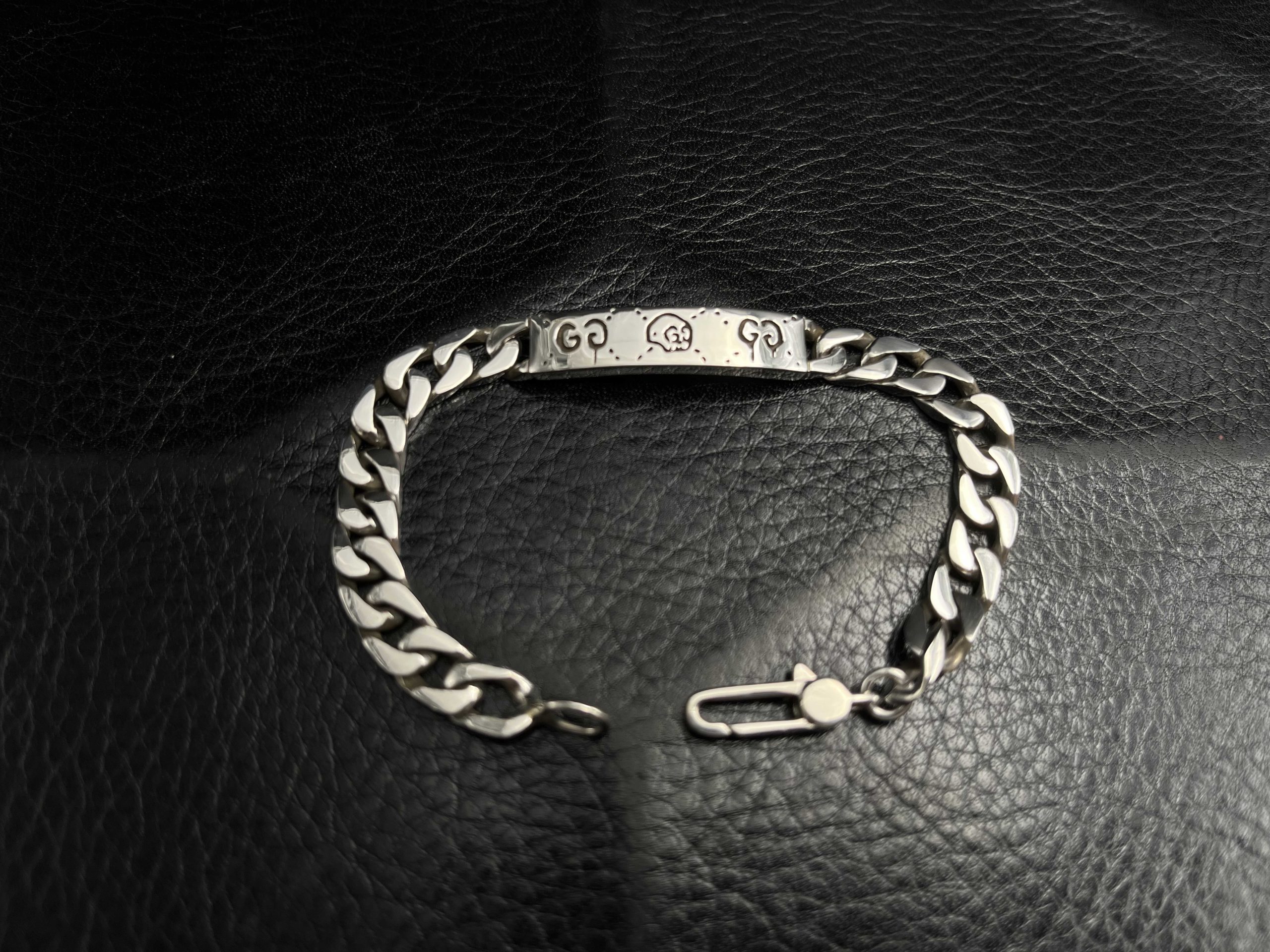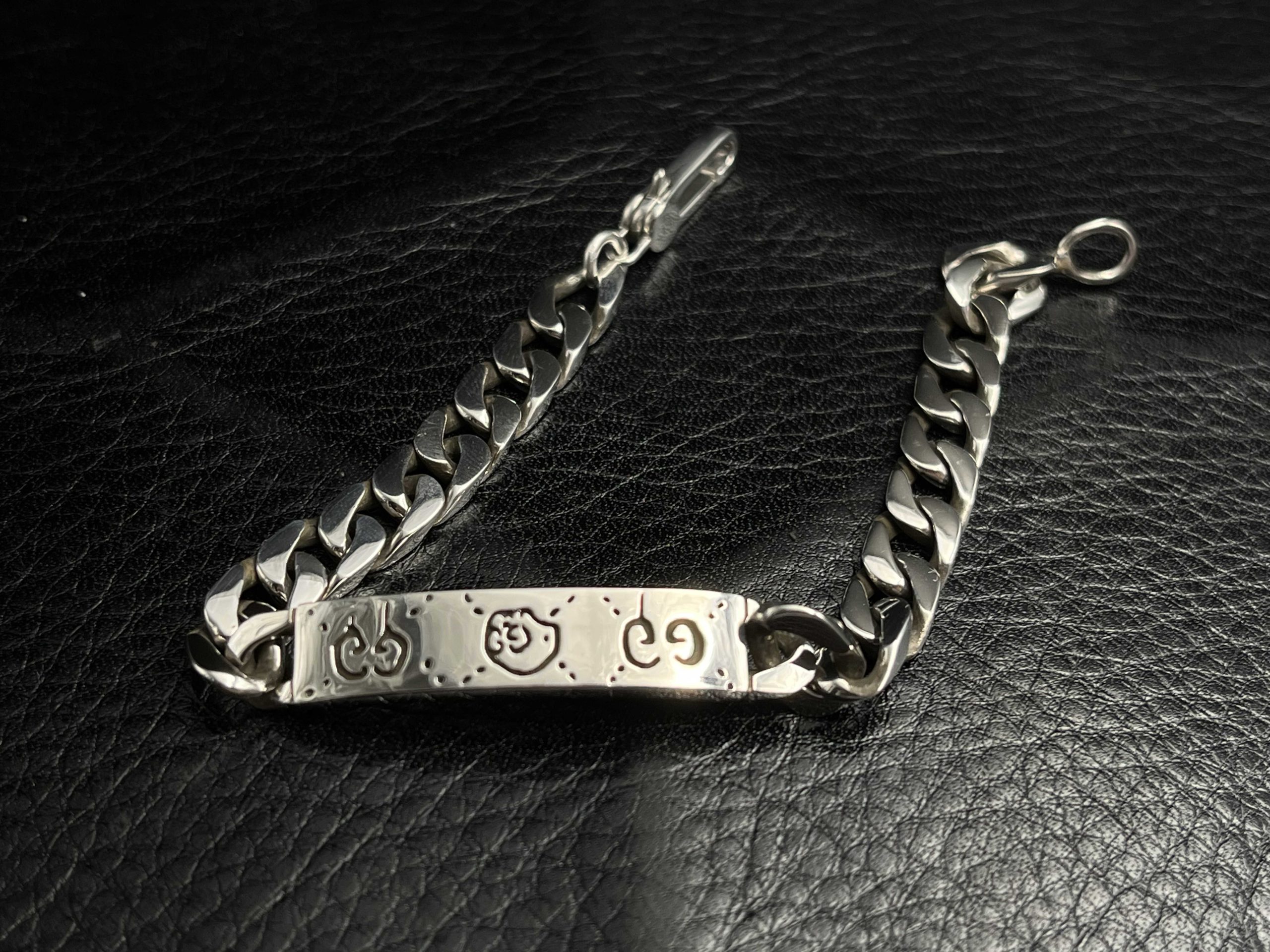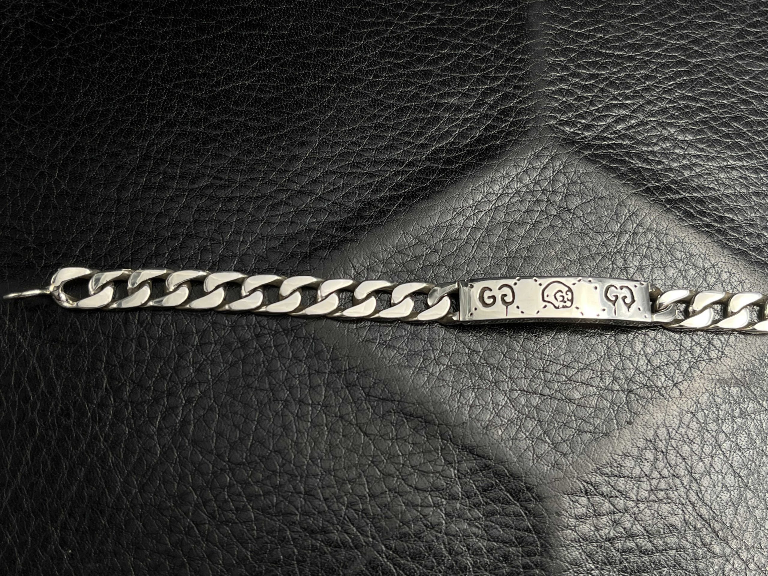 A contemporary interpretation of the classic ID bracelet, this GG piece pairs a bold curb chain with an engraved motif plate featuring signature house symbols. The polished silver construction gives it a clean, substantial feel, while the detailed engraving adds character and depth. Designed for daily wear, it balances modern minimalism with iconic Gucci-inspired detailing.