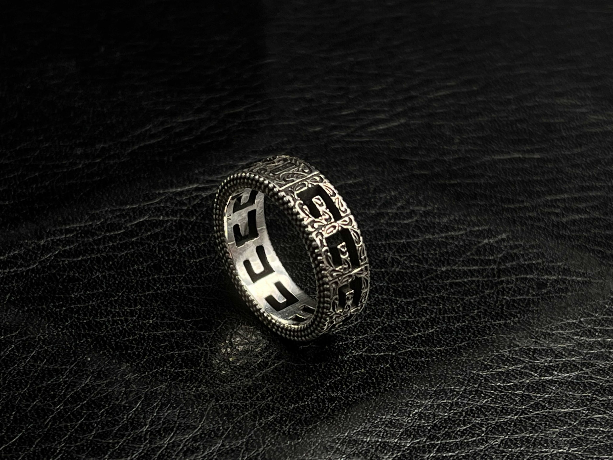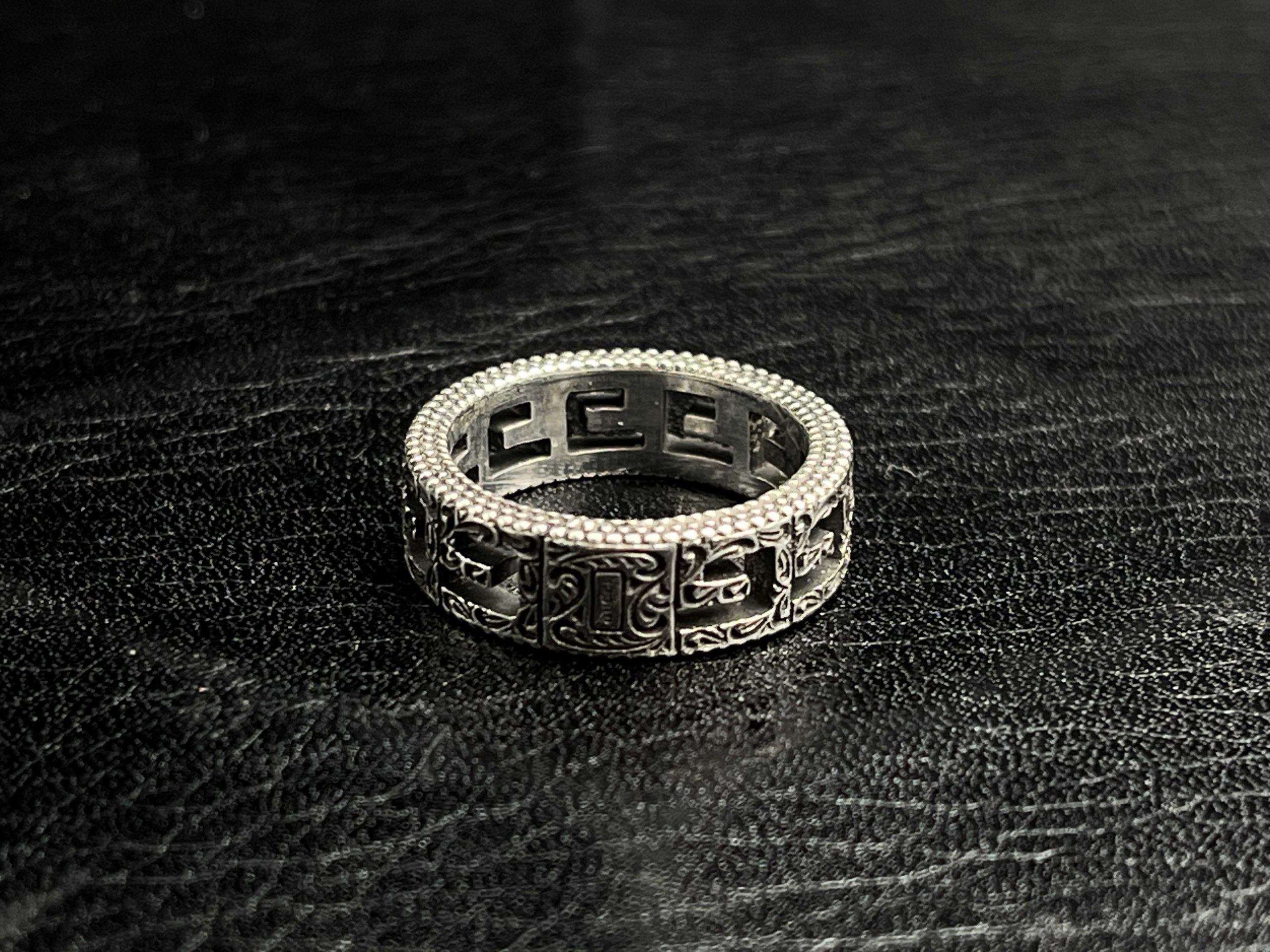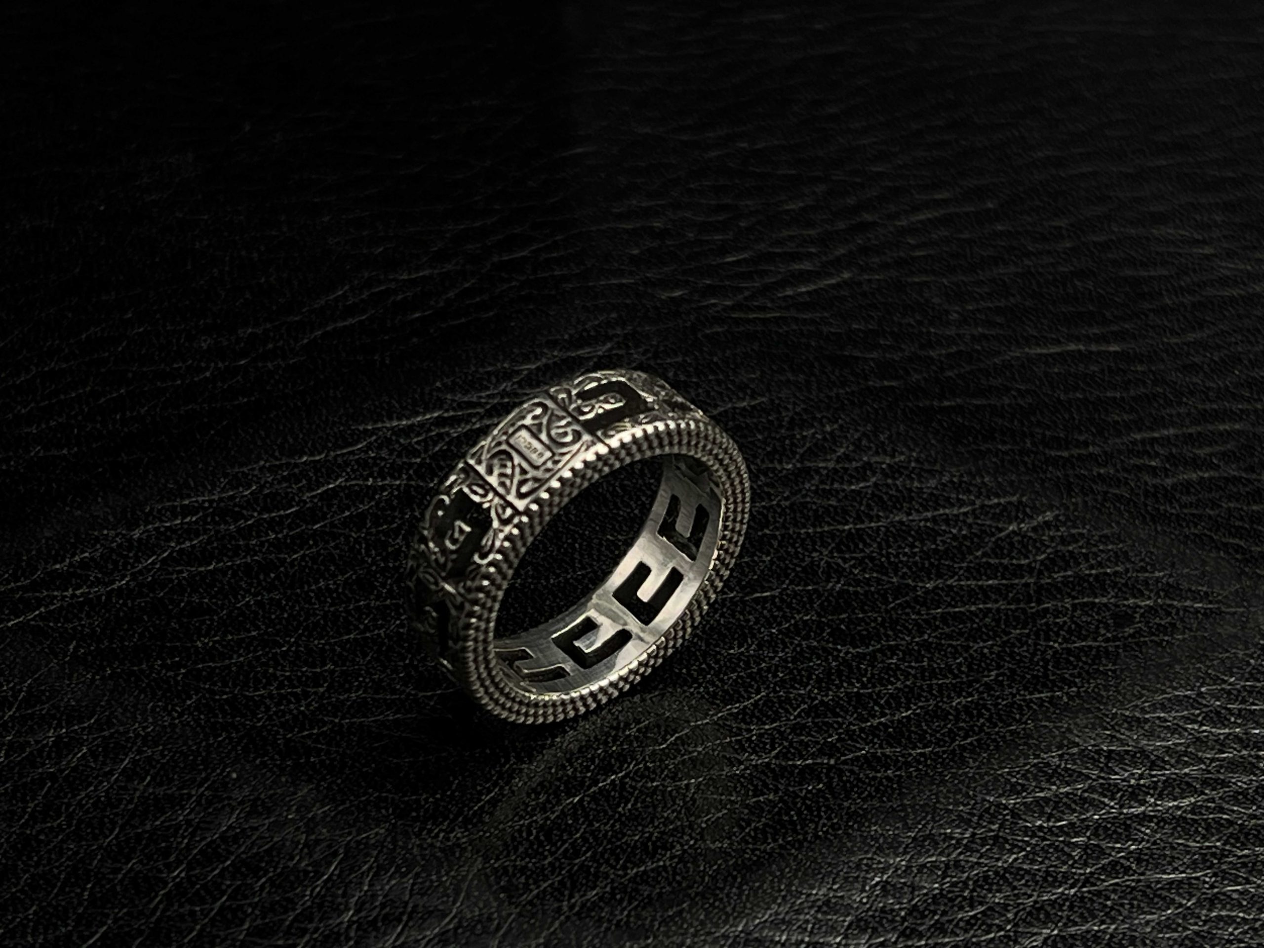 A sculpted band ring featuring the house’s archival Monogram motif, presented in an oxidized, engraved finish. The repeating interlocking pattern and beaded edges reference iconic metalwork, offering a piece that feels substantial, refined, and unmistakably signature.