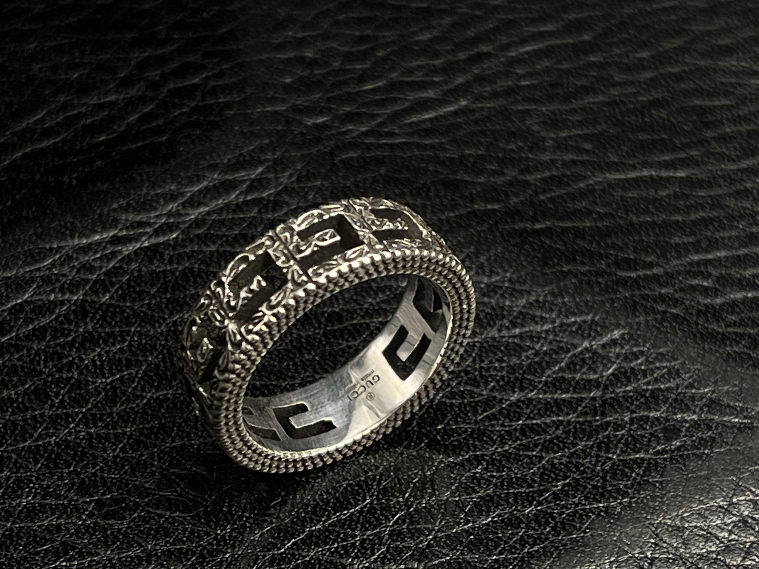 A bold engraved ring built around GG’s Icon motif and oxidized detailing.