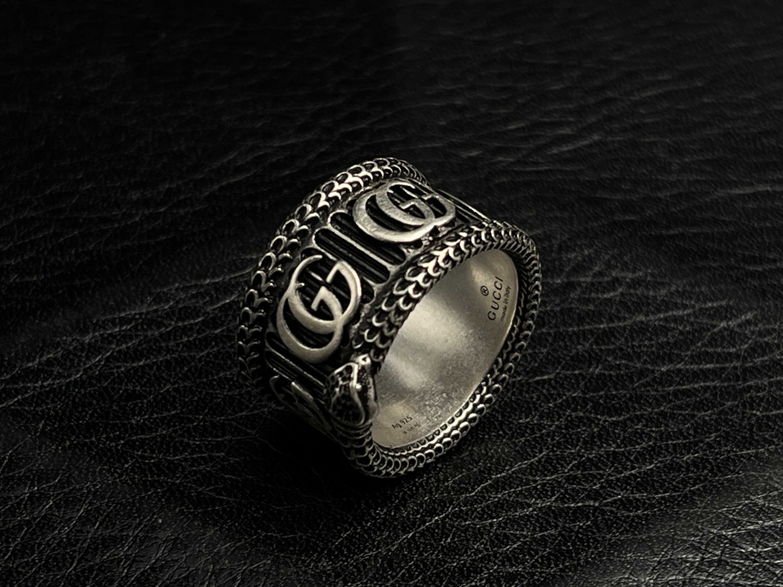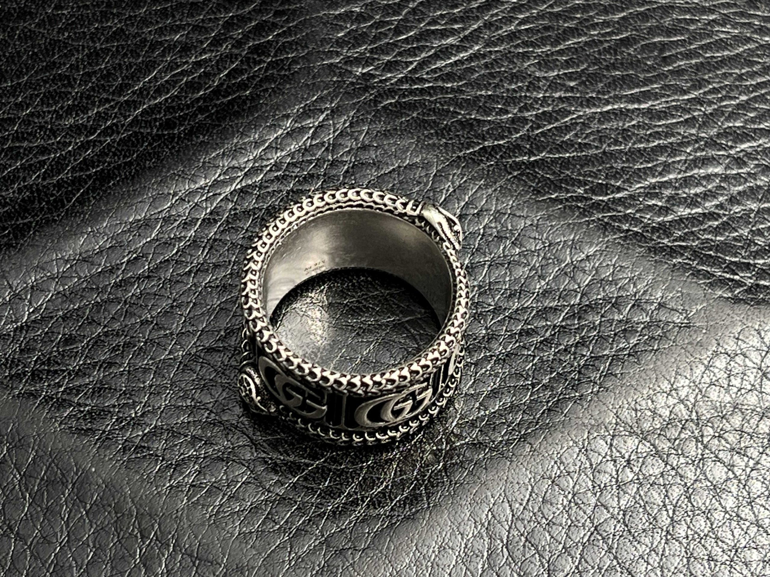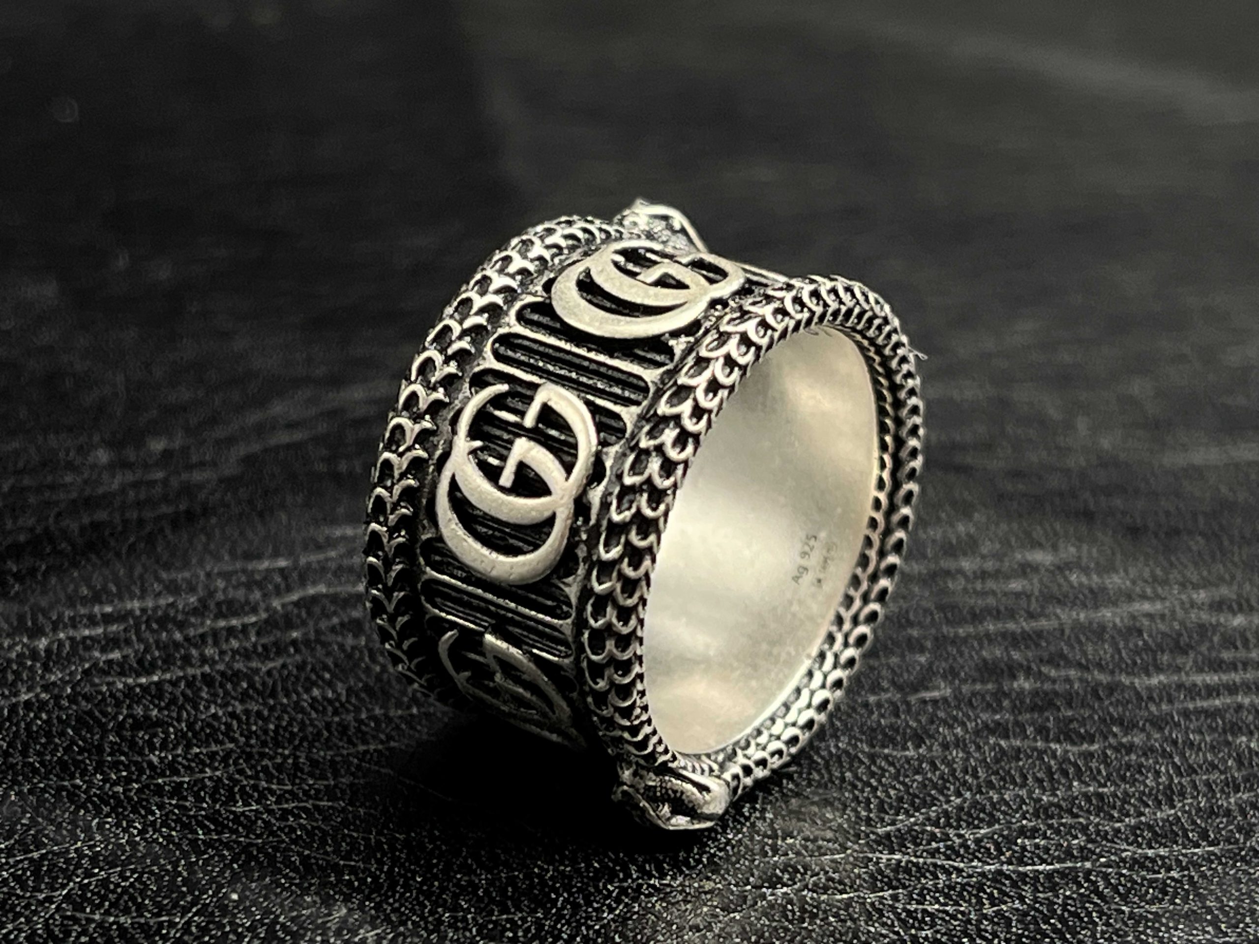 A striking GG statement ring combining bold monogram artistry with a coiled serpent motif—crafted in oxidized 925 sterling silver for a dark, architectural profile.