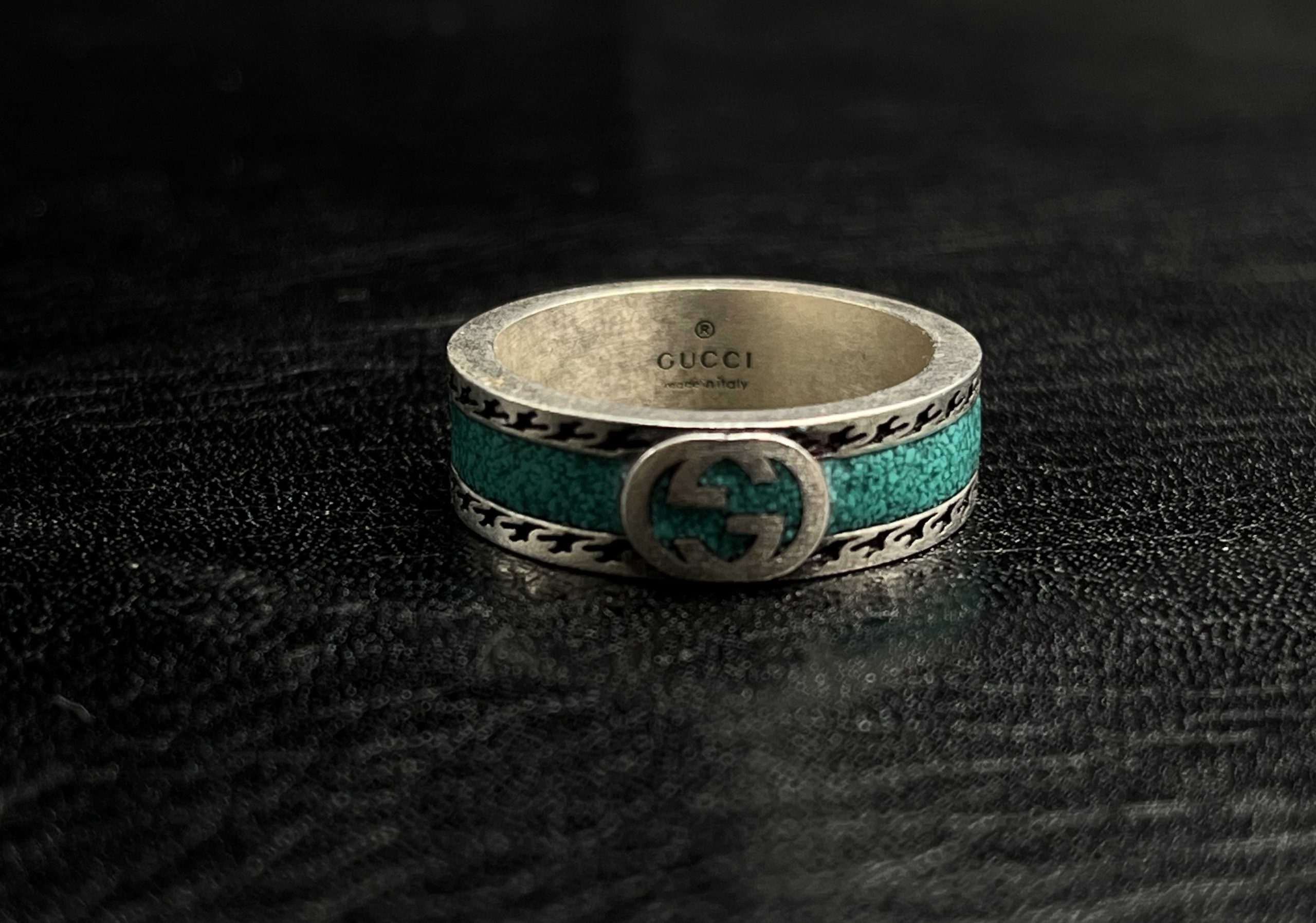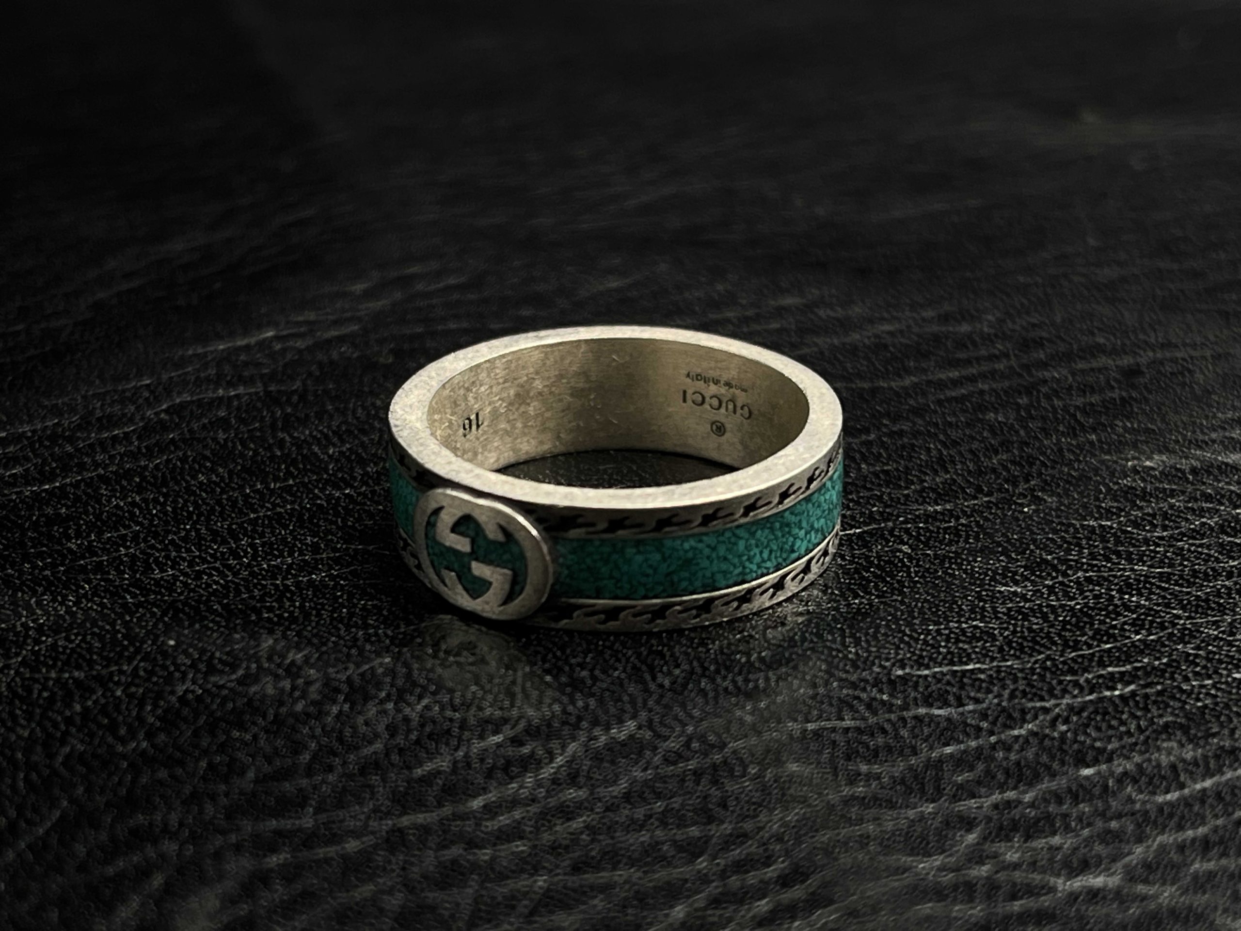 The GG Interlocking Enamel Band Ring features a crushed-stone inlay in a shiny Jade Green or black. Premium finish, iconic Interlocking GG emblem, and a high-quality enamel inlay.