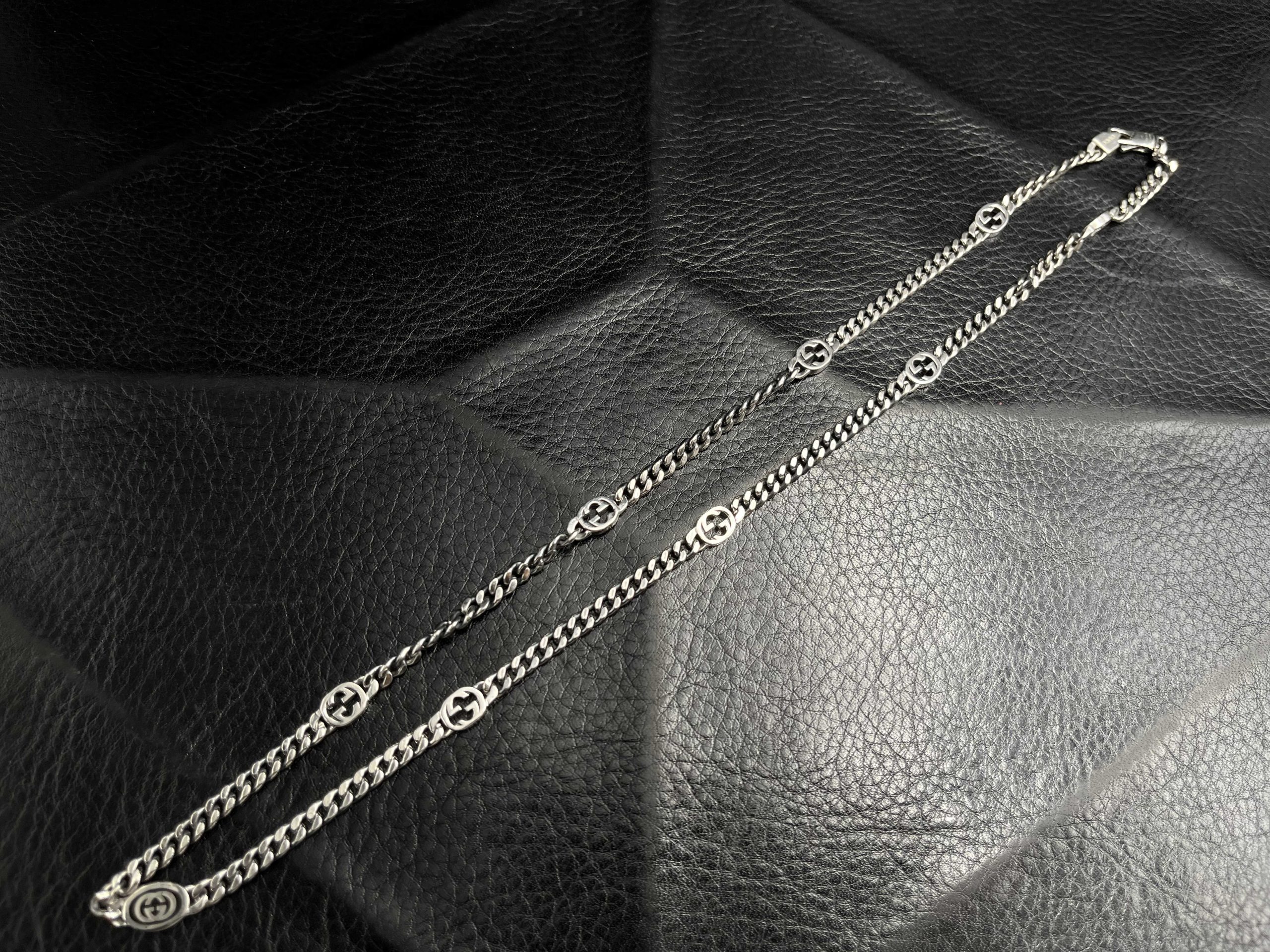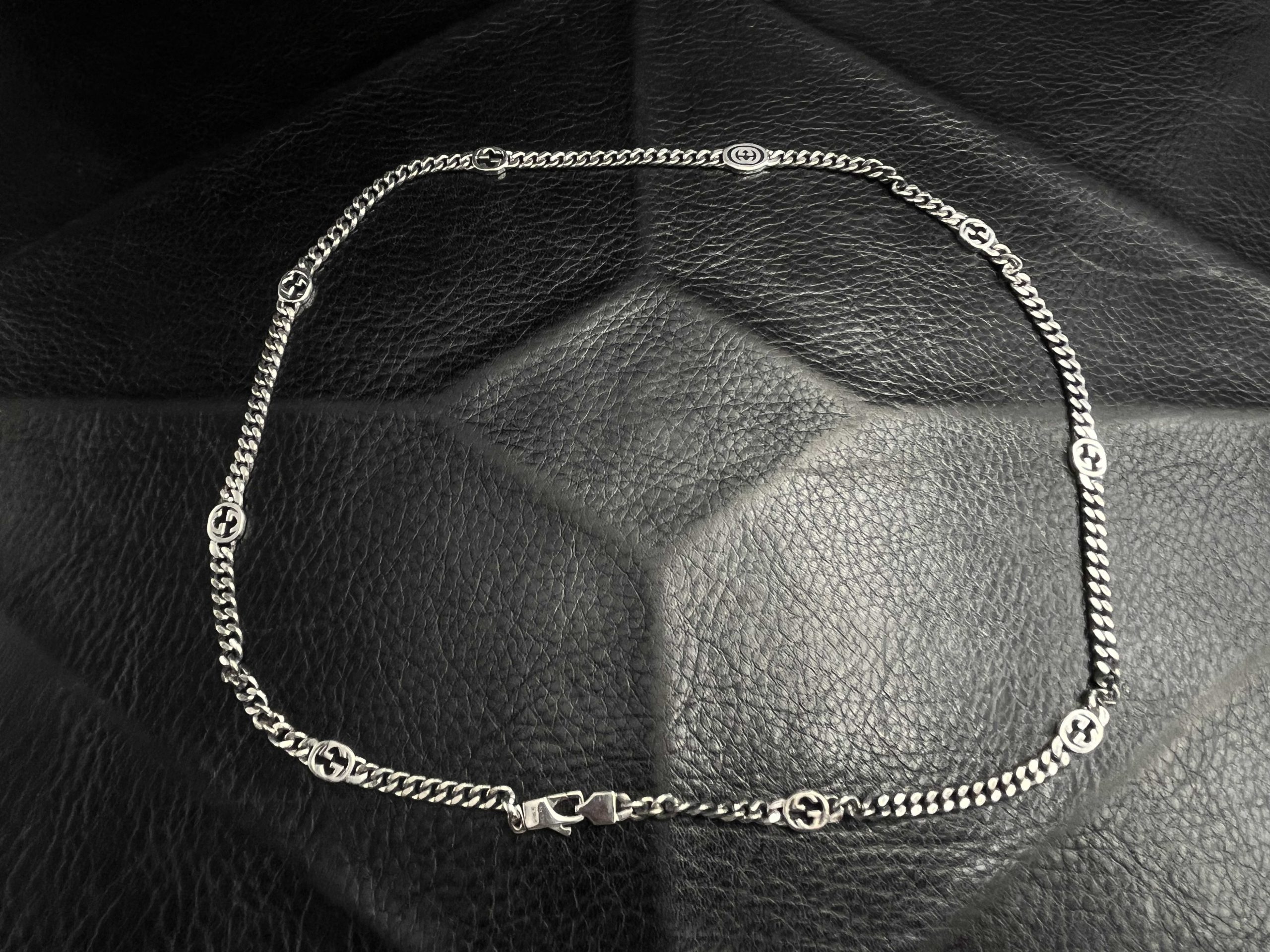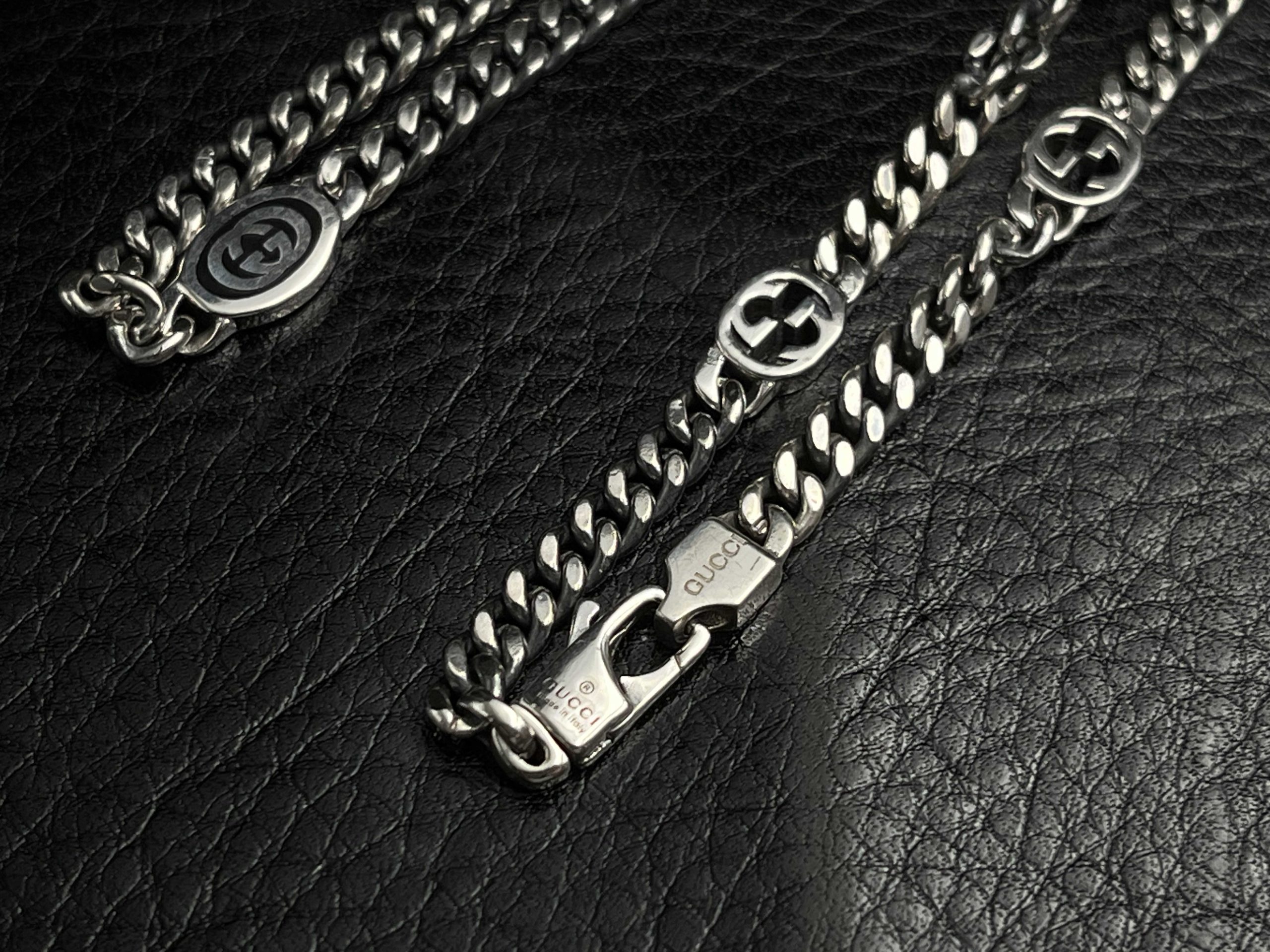 The GG Interlocking Link Chain Necklace embodies classic luxury with bold, structured detail. Crafted from solid 925 sterling silver, this 50cm curb-style chain features interlocking GG medallions placed evenly along its length, creating a refined balance between heritage design and modern minimalism. Each link is hand-polished for a mirror finish, complemented by a precision-engineered clasp engraved with the GG hallmark for a secure, seamless closure.