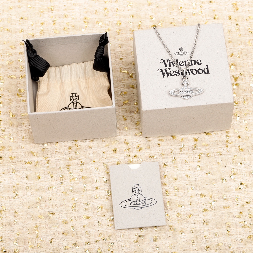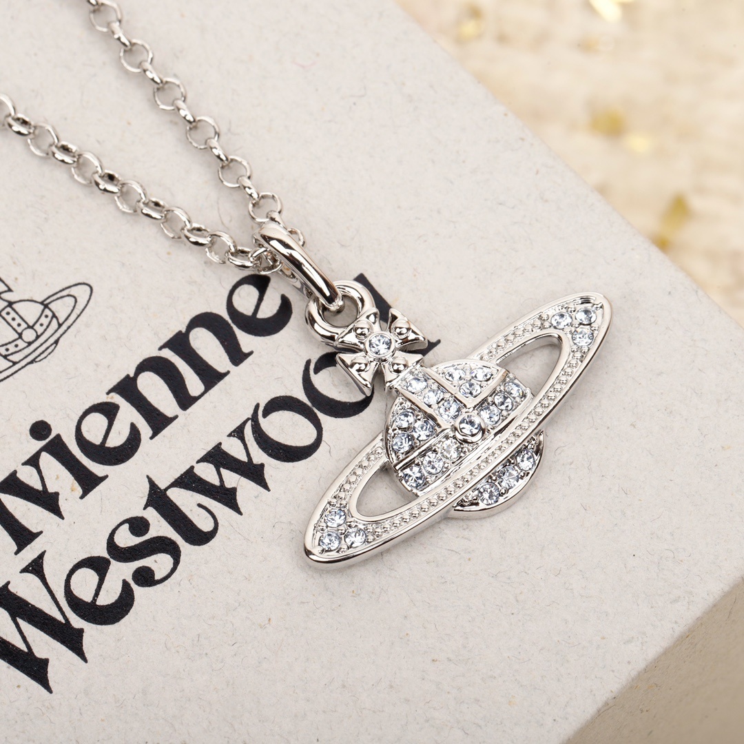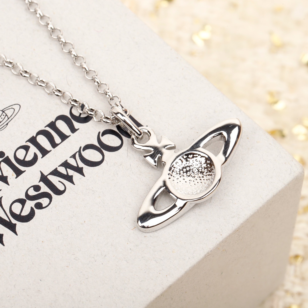 Suspended from a fine link chain, the pendant sits effortlessly at the neckline, offering balance and versatility whether worn alone or layered with other necklaces. The composition feels intentional and timeless — elegant enough for daily wear, yet unmistakably VW in character.